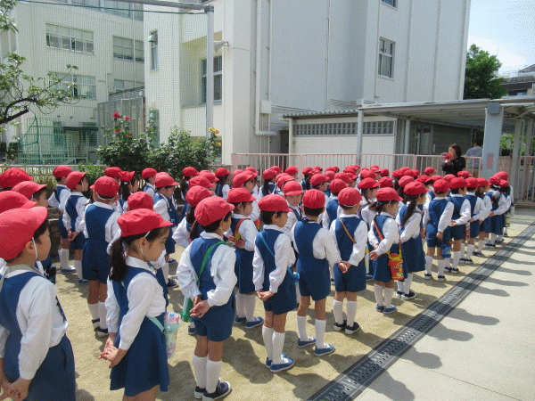 年長組の皆が園庭に集まると、今日の園外保育で怪我無く安全に、そして沢山の楽しい思い出をお土産に、幼稚園に帰って来れますように…お祈りをしました☆