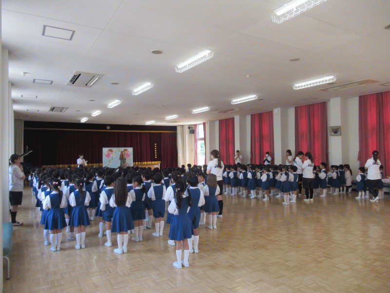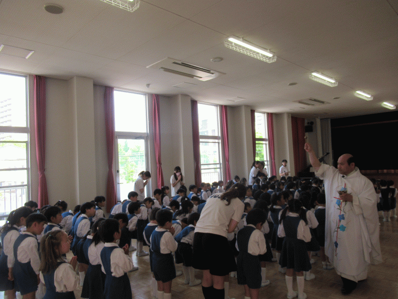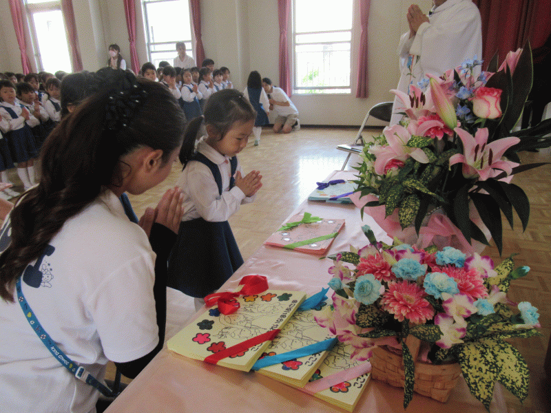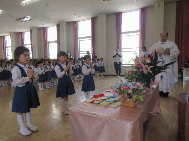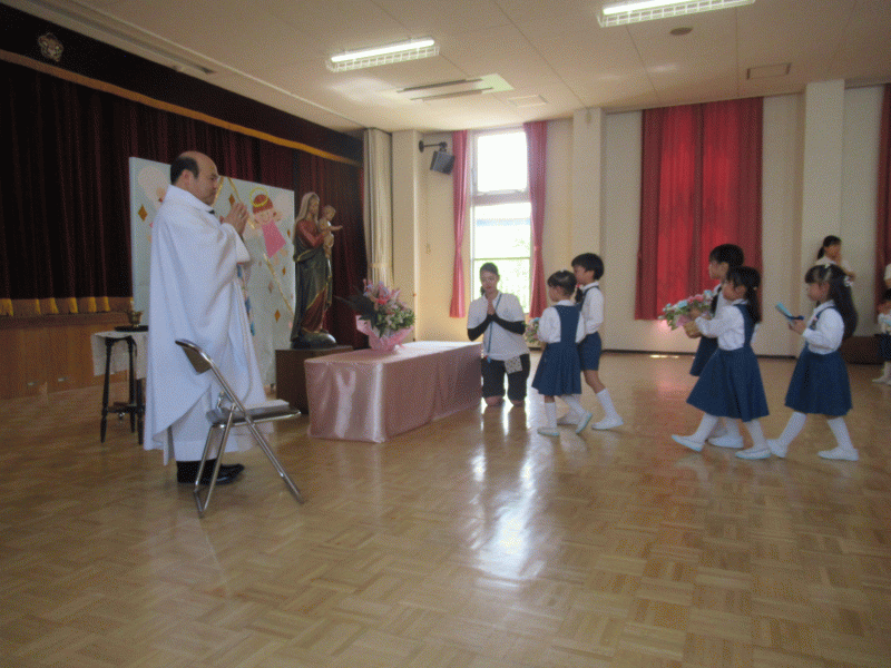 今年から全学年が遊戯室に集まり、吉田神父様司式のもと聖母祭を行いました。