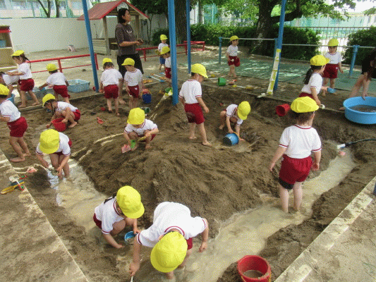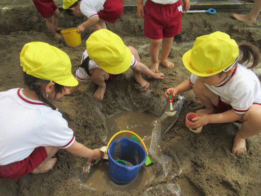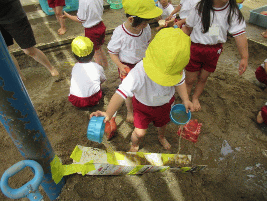 バケツで水を運んだり、シャベルで川を掘ったり、一番人気だったのは“おままごと”。小さいカップに水や泥を移し替えて、お友だちや先生と遊びます。