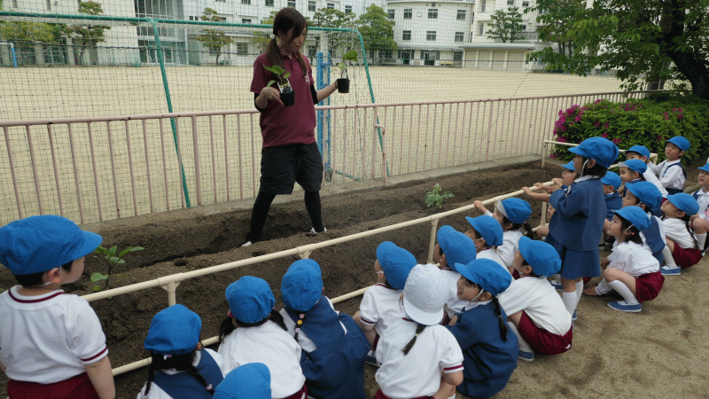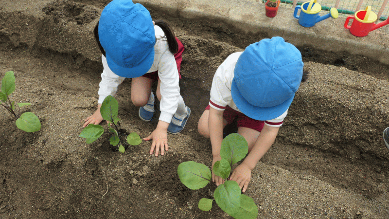 子どもたちに苗を見せて、「どんなのになるのかな?」と子どもたちは、楽しみにしながら植えることができました。