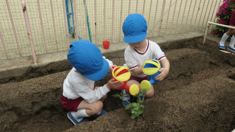 お野菜を育てるには、お水が大事!お水をあげるのは、お当番さんの仕事の一つです♪