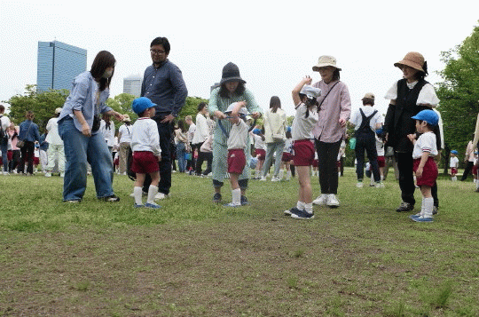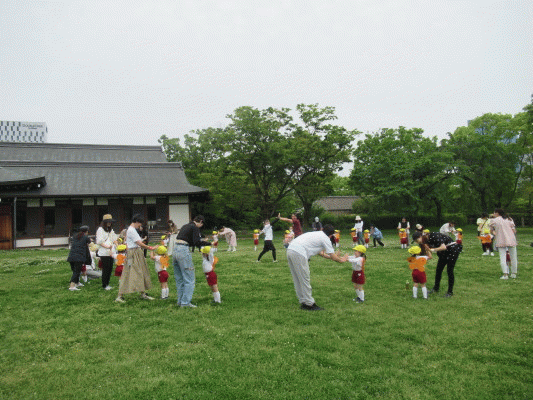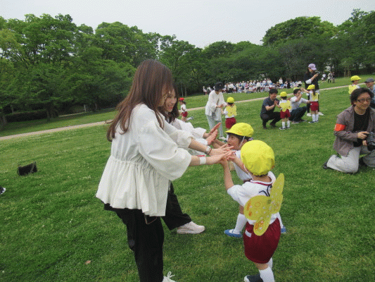 まずはじめに、円の真ん中に集まった子ども達が、お家の方のところへ「パタパタ〜」と飛んでいきました♪