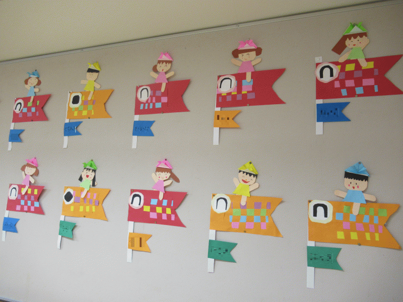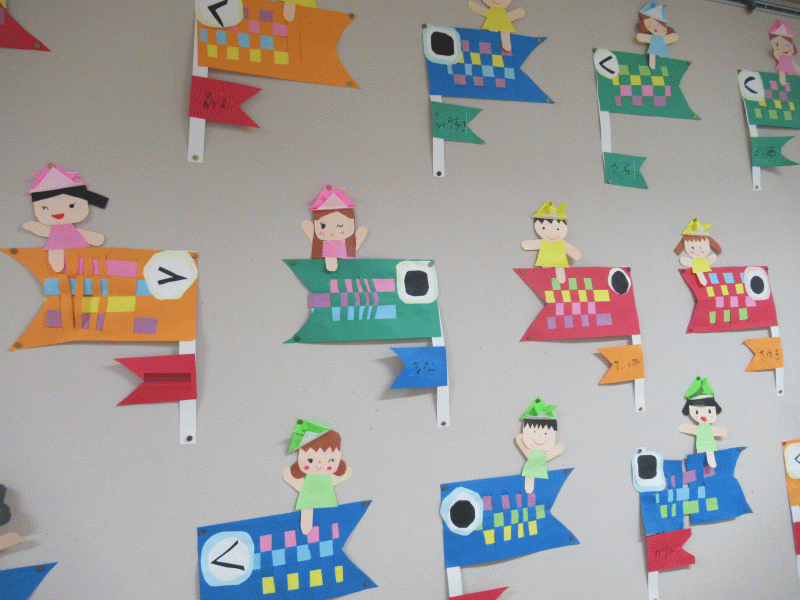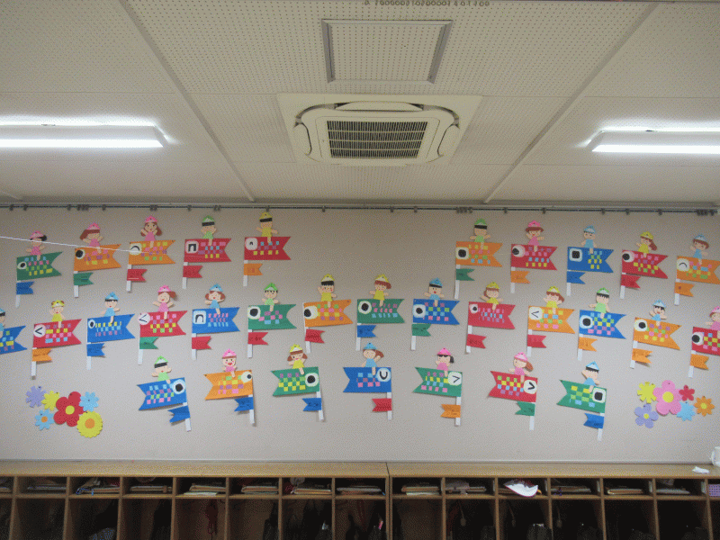 いろとりどりの素敵なこいのぼりが元気に泳いでいて、とても素敵な壁面になりました♪