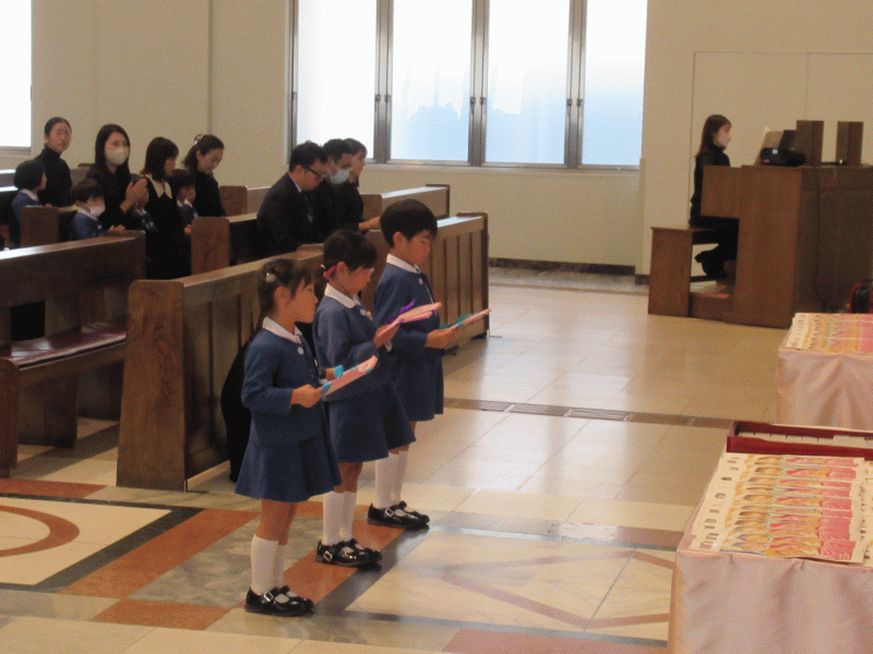 年長組の園児と保護者の方が大聖堂に集い、一人ひとりの成長を喜び、今まで見守ってくださった神様や周りの方々への感謝の気持ちを込めてお祈りをお捧げしました。