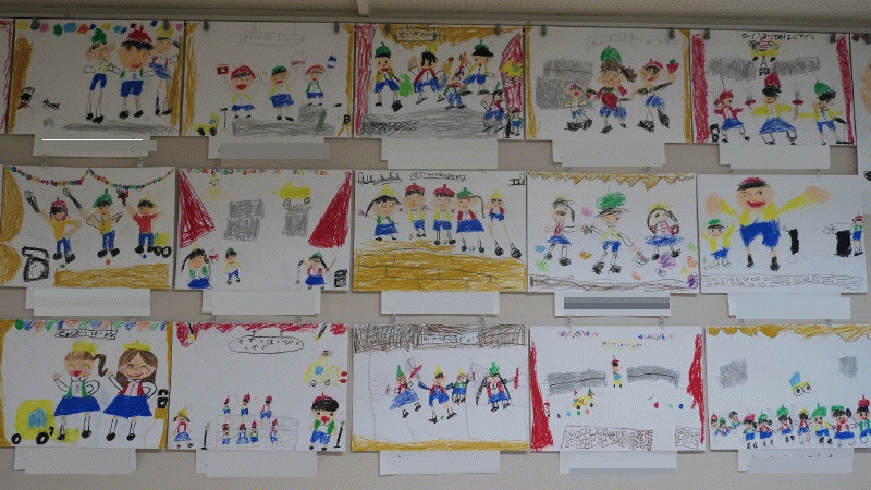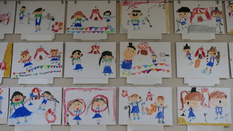 年中組の3月壁面は、クレパス画『発表会の絵』です♪