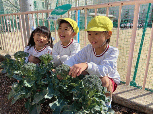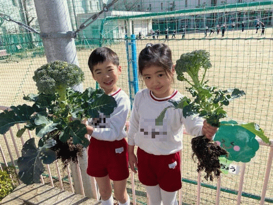 「葉っぱが伸びてるよ!」「ブロッコリーできてきた!」など、子どもたちは毎日観察して収穫をたのしみにしていました♪