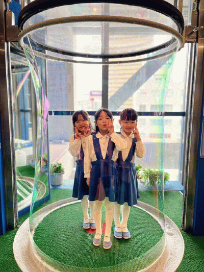 人が入れるしゃぼん玉コーナーでは、大きなしゃぼん玉の中に入りました。
