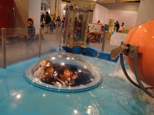 たまったら“ばっしゃーん!”とお水が上から降ってきて、ポンプを動かしていた子どもたちも、透明のカプセルの中に入っていた子どもたちもびっくりしていました。