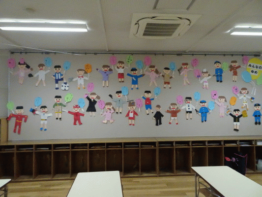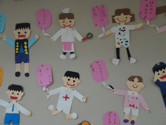 年長組3月壁面は、「将来の夢」を紙制作しました☆★