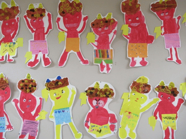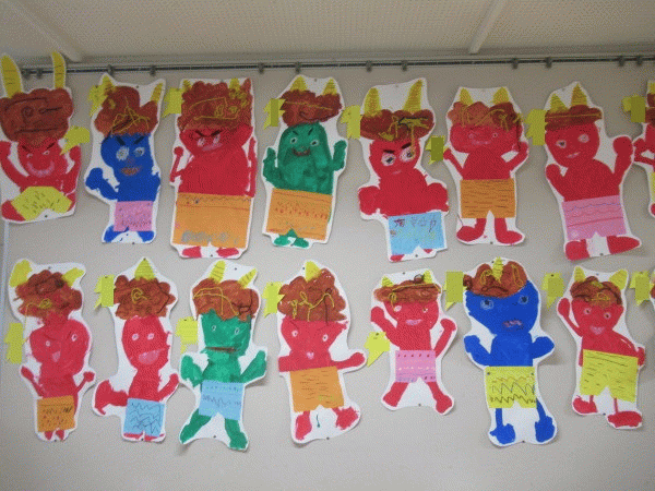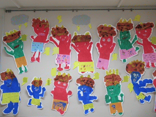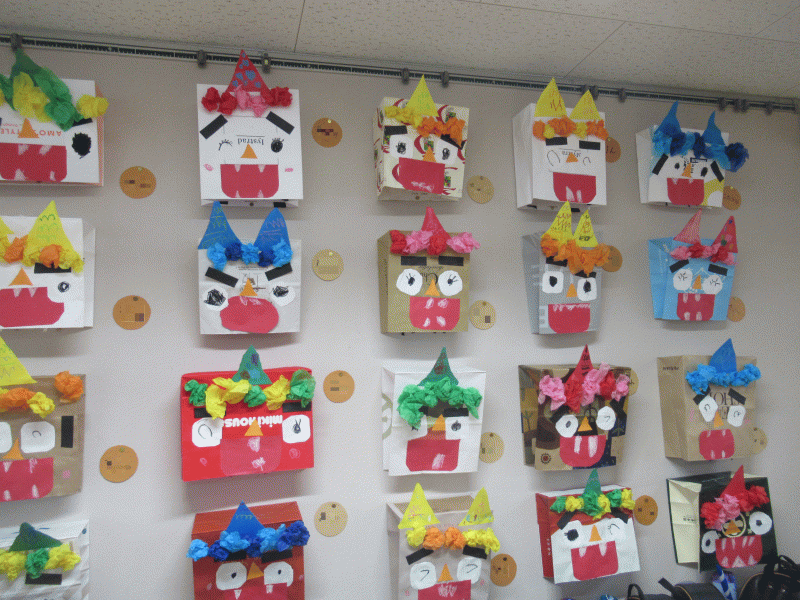 年中組の2月壁面は、絵画・制作「おに」です♪