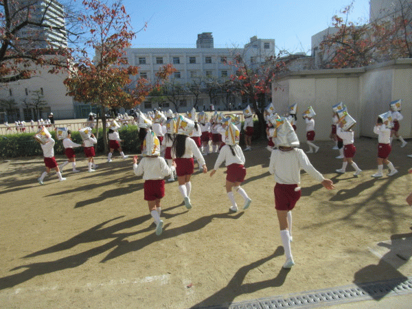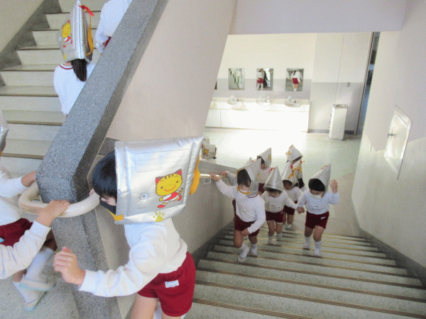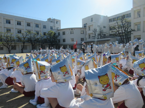 安全のために3階以上への避難が必要なため、幼稚園の子ども達は高校校舎の3階に避難します。