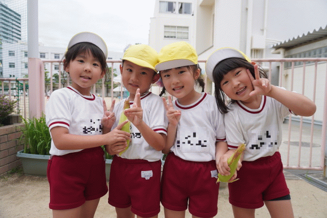 年長組で育てた「とうもろこし」「オクラ」が大きく育ったので、子ども達と一緒に収穫して、給食でいただきました(^O^)