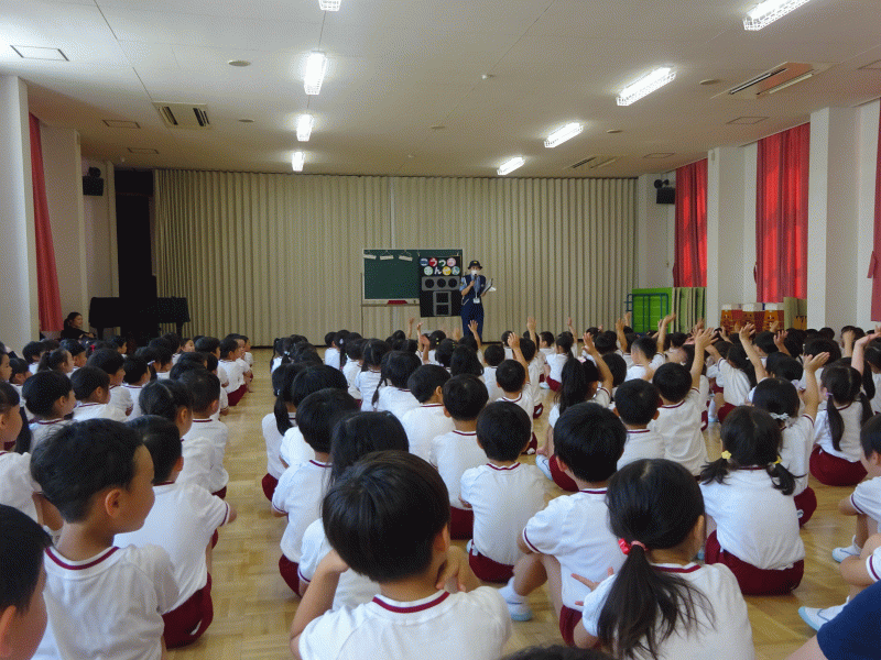 今日は、全園児が遊戯室に集まり、安全指導を受けました!