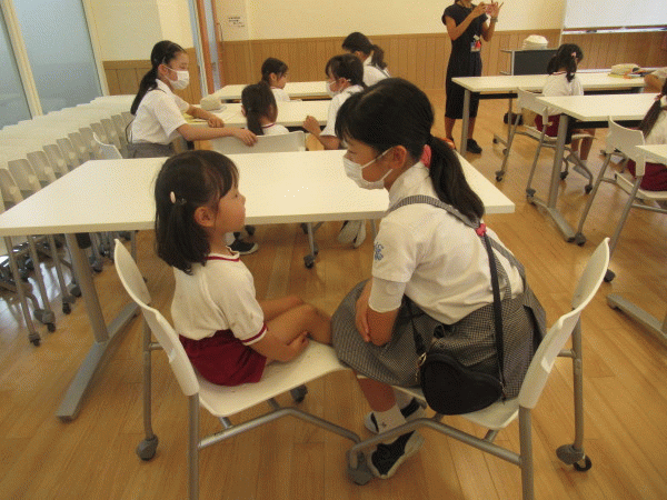 教室に着いたらお兄さんお姉さんとペアになって座りました♪