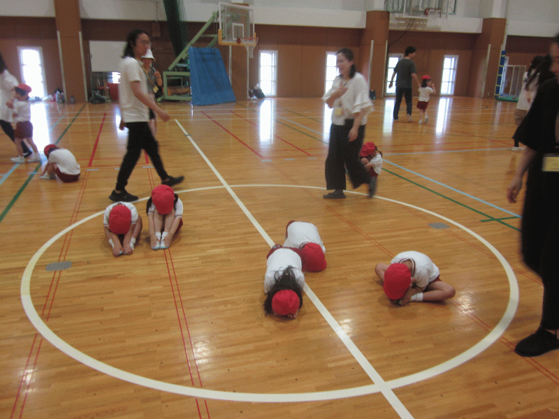 ワニ歩きでフープをくぐり、子どもたちは「気持ちい〜♪」と楽しんでいる様子でした(^O^)