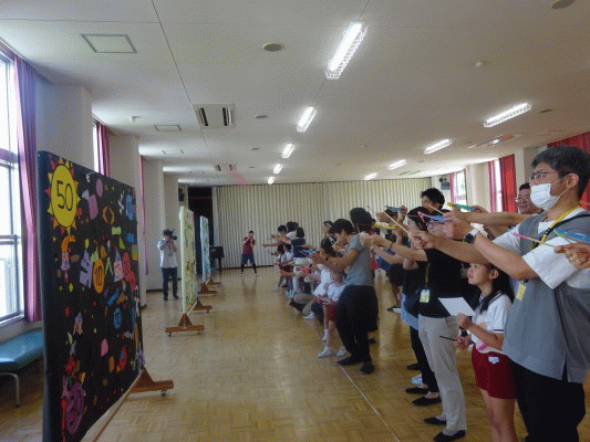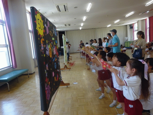 「スタート!」の声掛けでそれぞれ作ったものを飛ばし、「100点あたった!」「おしい〜!」とお家の人と盛り上がって、的あてを楽しんでいる様子が見られました☆