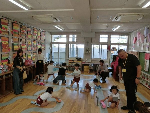 「道路」コーナーには、信号機やくねくねした道などがあり、子ども達はお友達と話したり、お家の人と一緒に走らせる姿が見られました♪