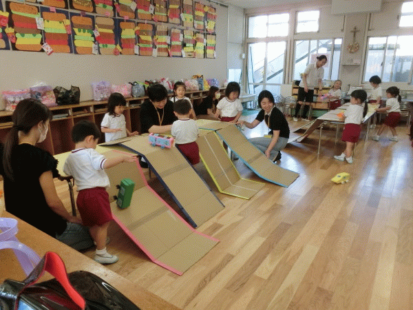 年少組は、お家の人と一緒に「車」や「新幹線」を作って遊びました!