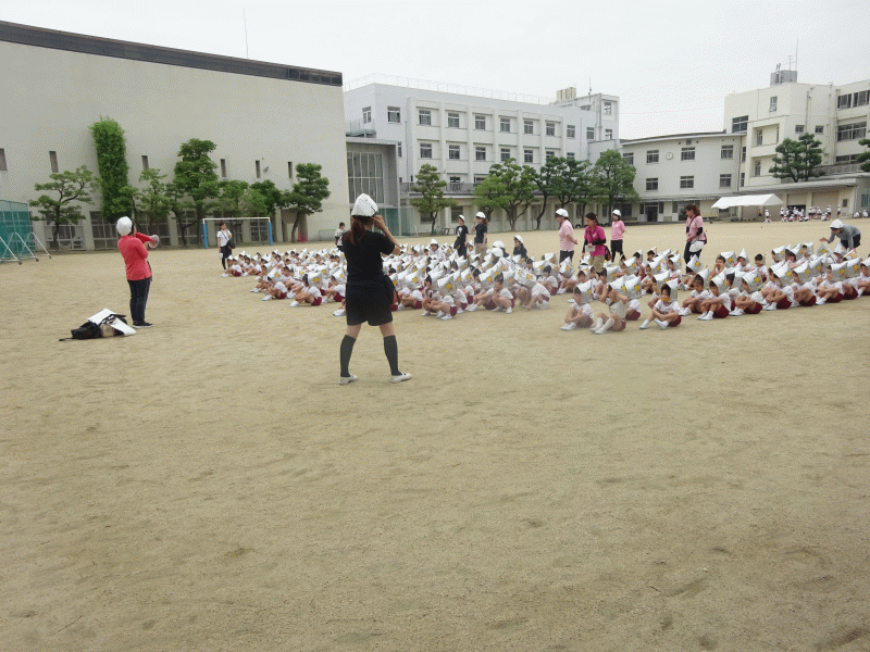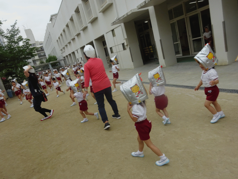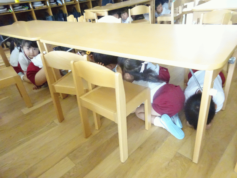 事前に地震が起きたらどうするのか…など、約束事を各クラスで話をしてから取り組みました。