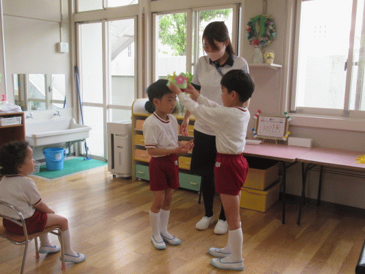 新入園児の年少さんと年中さんに、年長さんのお兄さんお姉さんからお花の冠をプレゼントしました☆