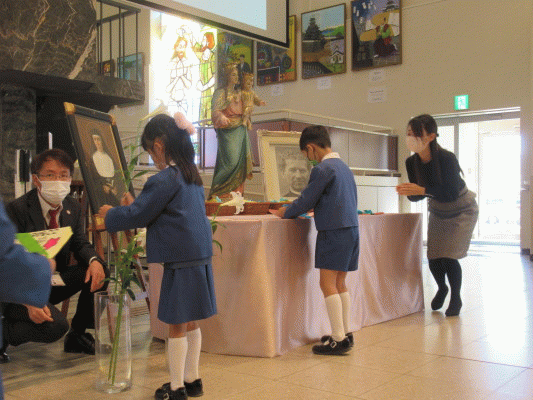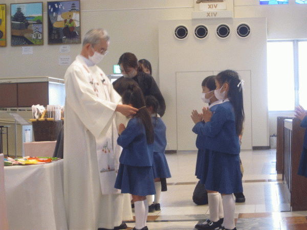 そのおメダイを神父様に一人ひとり掛けていただき、子どもたちの嬉しそうな表情がみられました。
