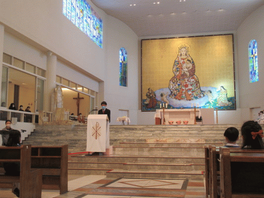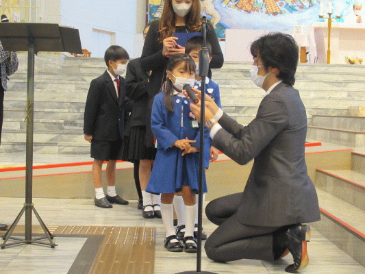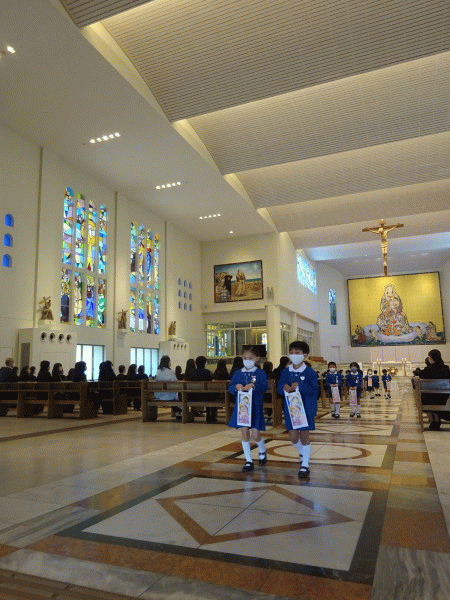 今年度は、大聖堂に全園児と年長組の保護者の方が集い、一人ひとりの成長を喜ぶと共に、今まで見守ってくださった神様や周りの方たちへの「ありがとう」の気持ちを込めてお祈りをお捧げしました。
