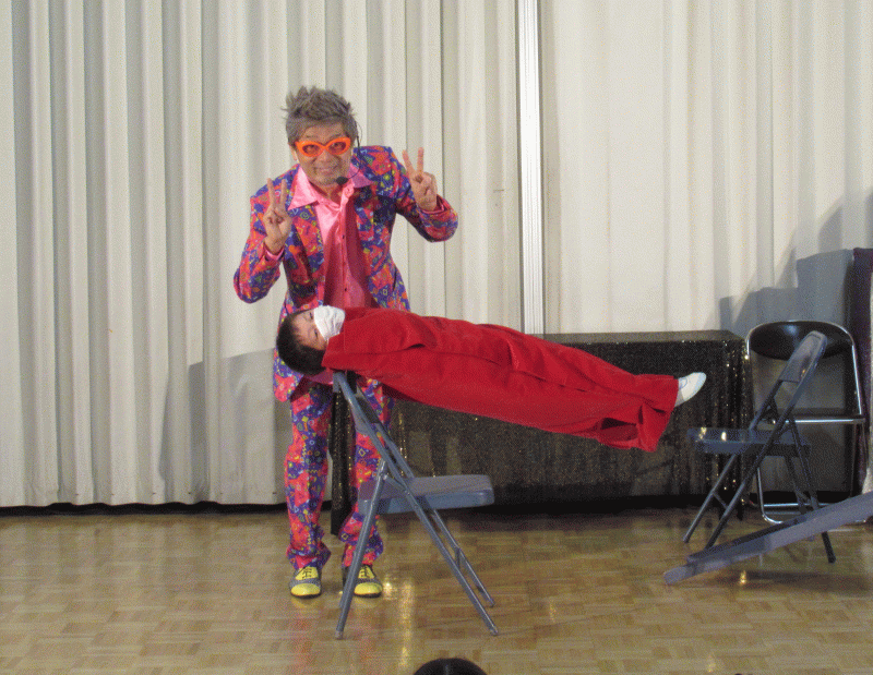 そんななか、2つのイスの上に置いた台にお友達が寝そべり、呪文をかけてから1つのイスと台を抜くと・・・