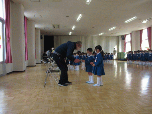 次に年中組と年少組から、カードとお菓子のプレゼントをしました。