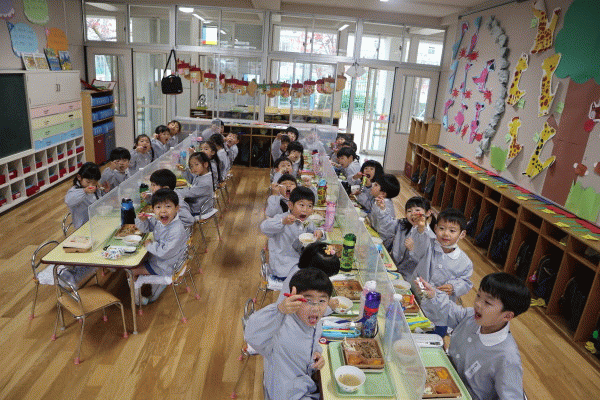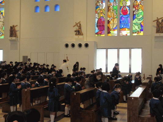 お祈りの集いでは、幼稚園園児、小学校低学年、