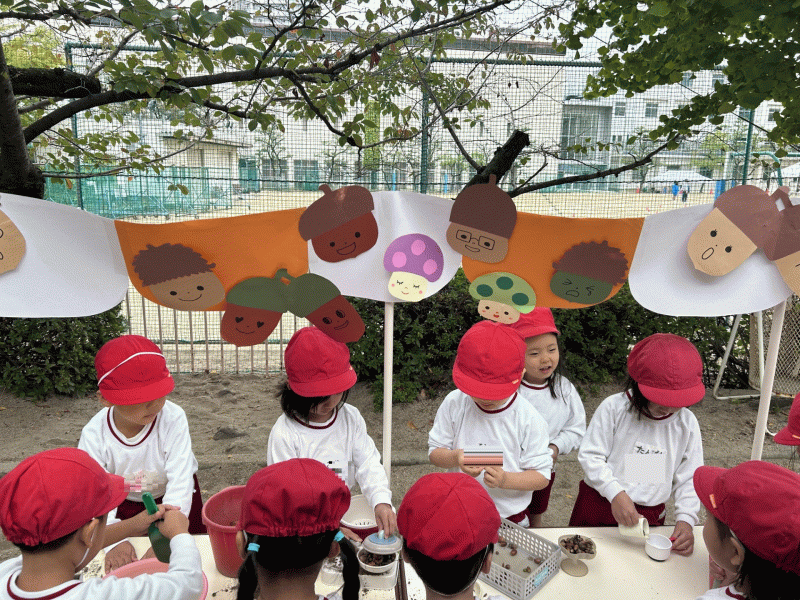 集めていただいた沢山の木の実を使って、お砂場でごっこ遊びをしました♪