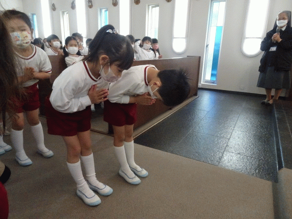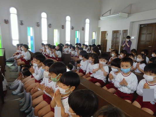 「周りにある土や植物は、神様からのお恵みをいただいて生まれました。年長組のお友だちも、神様からのお恵みでこんなに大きく成長できましたね。そのお恵みに感謝をして、これから色々なことに一生懸命取り組んでいってね」とお話を頂きました。