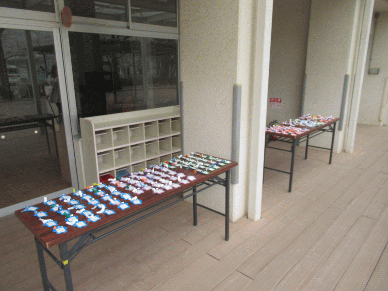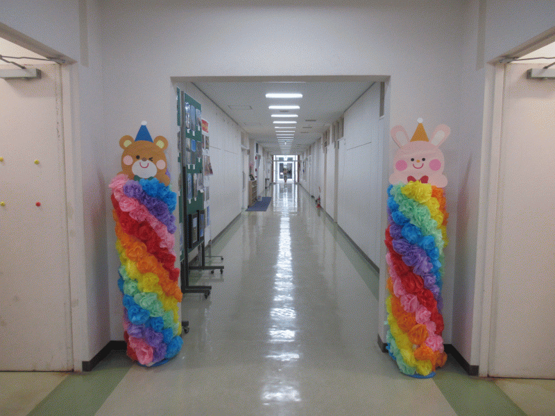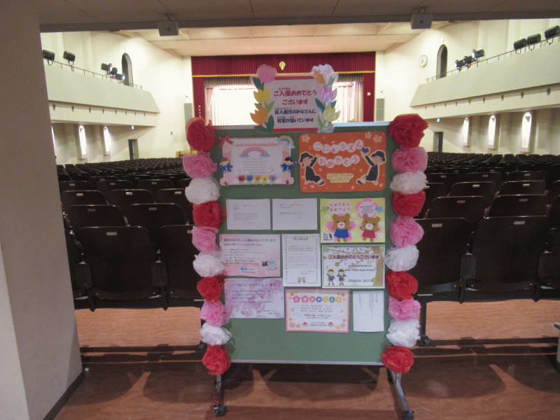 講堂の中には、いろんなところから届いた「にゅうえん おめでとう!」のお祝いメッセージが飾られていました。うれしいですね。