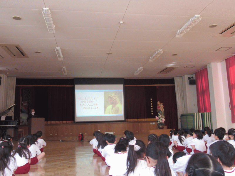 神様のお話を聞くお御堂訪問(宗教)は、昨年に引き続き、工事の関係でお御堂訪問が出来ないため、みんなのことをいつも見守ってくださっているマリア様を遊戯室に飾って行います。お話は、野上シスターがしてくださいます。