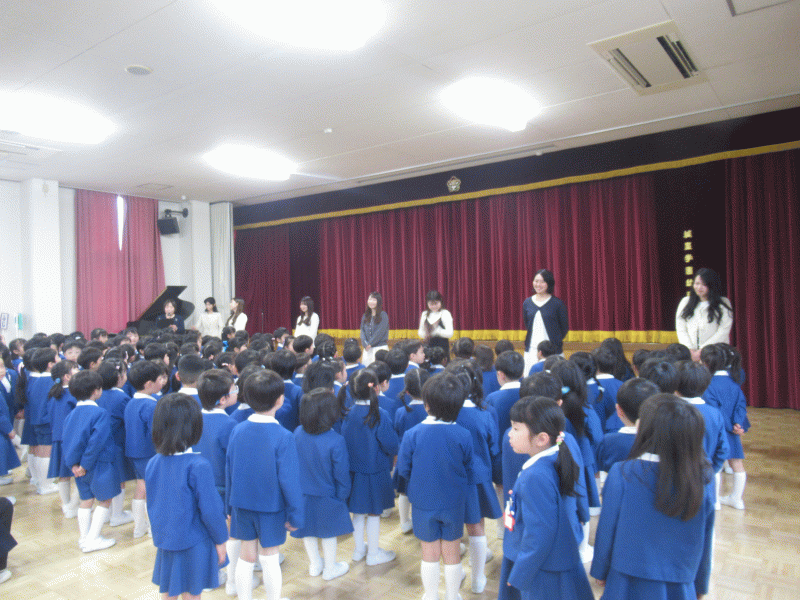 園長先生から「ひとつ大きくなりました。この1年、目標をもって過ごせたらいいなと思います。何にしようか考えてみましょうね!」「10日に入園式があって、年少組さんが幼稚園にきます。よろしくお願いしますね!」とお話がありました。お話を聞いていた子どもたちは、「優しくしてあげる!」「まかせて〜!」と年少組さんを迎える準備ができているようでした。