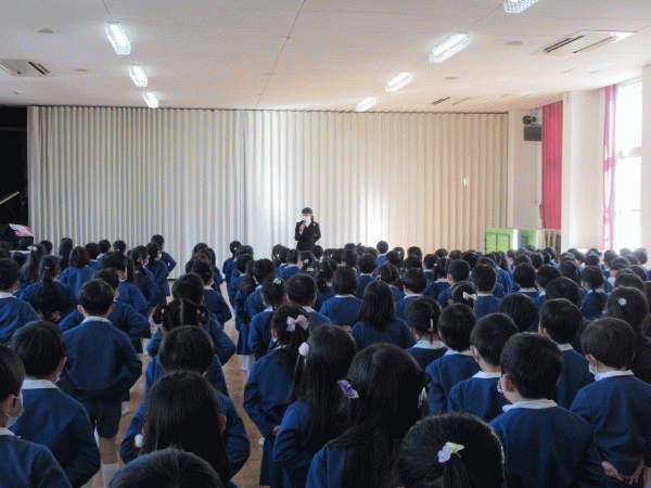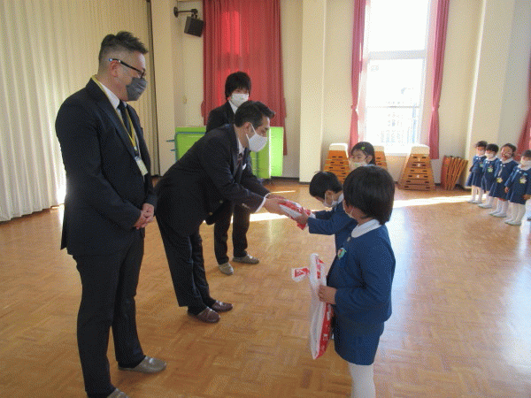 園長先生からは、「寒い日が続きますが風邪を引かないように、またコロナウイルスに感染しないように手洗いうがいを忘れずにしましょう。そして、世界中にはまだまだ困っている人が沢山います。今、みんなが元気に幼稚園に来ることができていることに感謝して過ごしましょう。」とお話をいただきました。