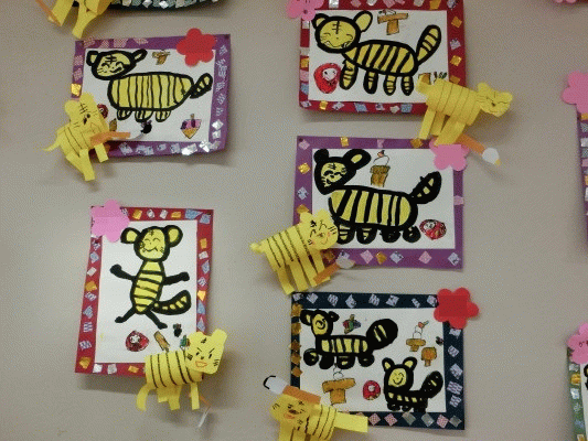 作品の側には、画用紙で作った『トラ』が・・・ そのトラに筆を持たせて完成です!