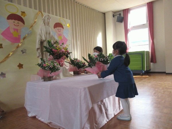 幼稚園でも、遊戯室にて「無原罪のマリア様の祝日会」を行いました。そして、城星学園の創立記念日でもあり、あわせてお祝いをしました。