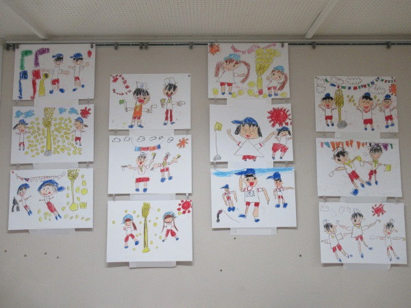 年中組の10月の壁面は、クレパス画の「運動会の絵」です!!