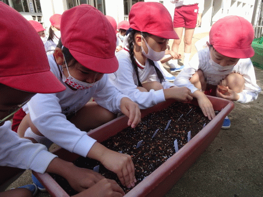 今日は、年中組で冬野菜の「はつか大根」と「えんどう」の種をまきました♪