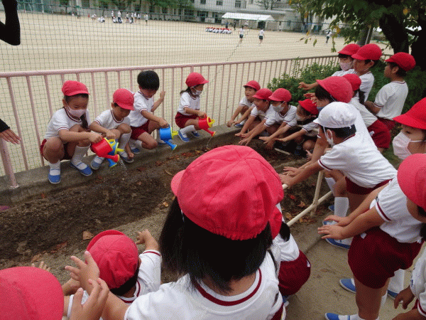 年長組では、冬野菜『こまつな』『みずな』の種をまきました☆