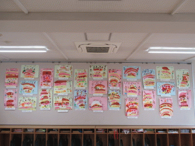 年中組の7月の壁面は、絵の具で「ケーキ」を描きました(^^)