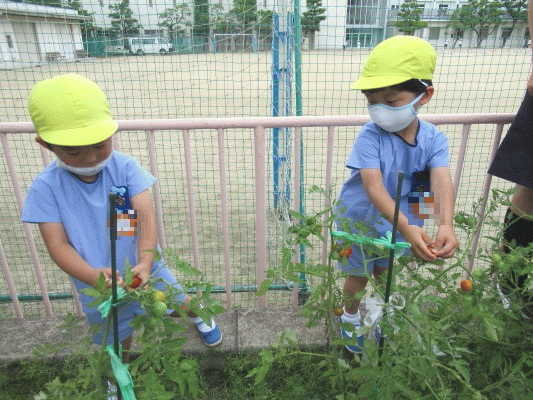 戸外へ行った際には、「赤いトマトは増えているかな」と気にして見ていた年少さん♪