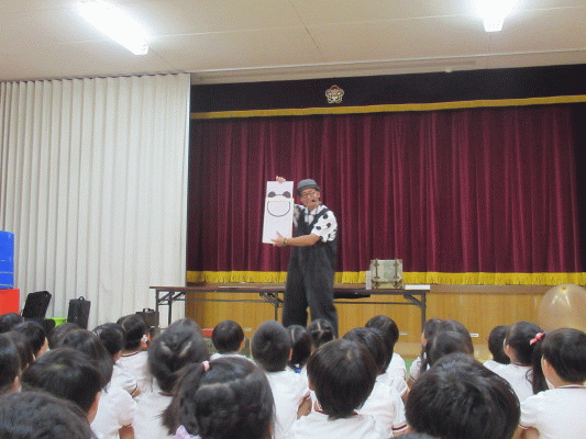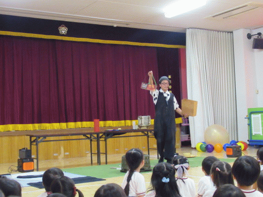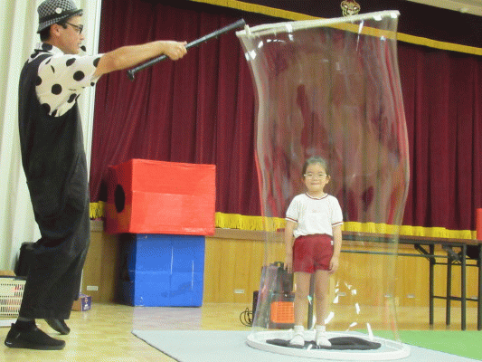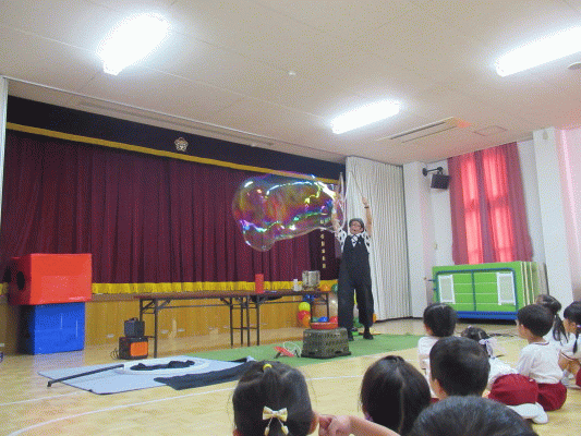 今日は鑑賞行事として、“しゃぼん玉おじさん”による『サイエンスバブルショー』を見ました!