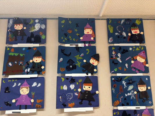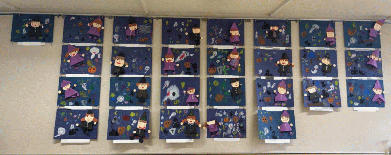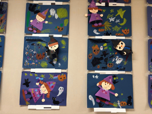 画用紙で立体的な魔女を作り、周りにはおばけや、ジャックオランタンなど、ハロウィンの雰囲気をイメージしながら表現しました☆