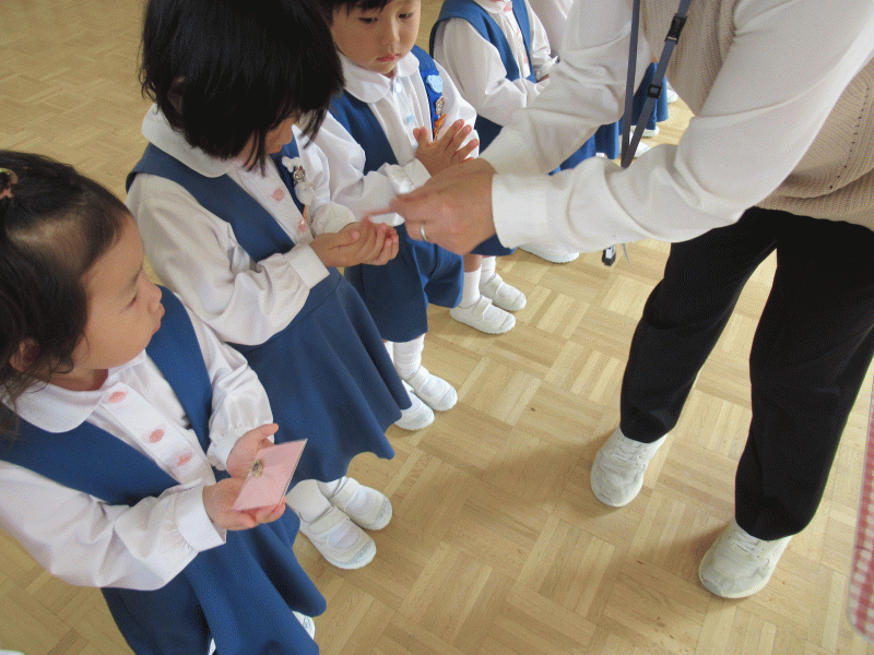 園長先生からおメダイのプレゼントをもらい、「すべての人に、やさしく温かい心をもって関わることができるように過ごしましょう。」とお話をいただきました。
