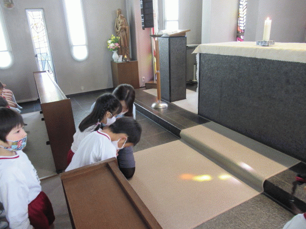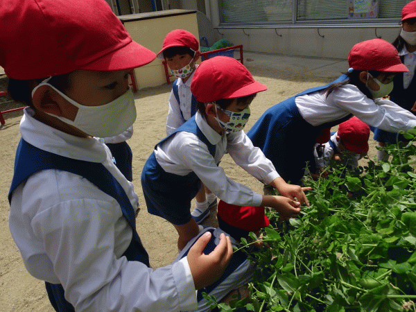 全 2086 件(全418ページ) 過去のページもご覧いただけます ⇒ 前へ 121 | 122 | 123 | 124 | 125 | 次へ 2021/4/30 年少組 プチトマトを植えました☆ 今日は、プチトマトの苗を植えました。 「これ、なーんだ?」という問いに、「葉っぱ!」と元気に答える子ども達(*^O^*) 「そうだね。この葉っぱは大きくなると、プチトマトができる葉っぱなんだよ。」 というお話に、不思議そうに見つめる様子が見られました。 今日は、プチトマトの苗を植えました。 「これ、なーんだ?」という問いに、「葉っぱ!」と元気に答える子ども達(*^O^*) 「そうだね。この葉っぱは大きくなると、プチトマトができる葉っぱなんだよ。」 というお話に、不思議そうに見つめる様子が見られました。 「どうやってトマトができるの?」 「大きくなるの?」 子ども達から、たくさんの“はてな?”がでてきました★ ふかふかの畑に、プチトマトの苗を植えます。 「どうやってトマトができるの?」 「大きくなるの?」 子ども達から、たくさんの“はてな?”がでてきました★ ふかふかの畑に、プチトマトの苗を植えます。 最後に、「おおきくなーれ!」と、おまじないをかけながら水やりをしました! これから、みんなでプチトマトの成長を観察しながら、見守っていきたいと思います♪ 最後に、「おおきくなーれ!」と、おまじないをかけながら水やりをしました! これから、みんなでプチトマトの成長を観察しながら、見守っていきたいと思います♪ 年少組 プチトマトを植えました☆ 2021/4/30 今日は、プチトマトの苗を植えました。 「これ、なーんだ?」という問いに、「葉っぱ!」と元気に答える子ども達(*^O^*) 「そうだね。この葉っぱは大きくなると、プチトマトができる葉っぱなんだよ。」 というお話に、不思議そうに見つめる様子が見られました。 今日は、プチトマトの苗を植えました。 「これ、なーんだ?」という問いに、「葉っぱ!」と元気に答える子ども達(*^O^*) 「そうだね。この葉っぱは大きくなると、プチトマトができる葉っぱなんだよ。」 というお話に、不思議そうに見つめる様子が見られました。 「どうやってトマトができるの?」 「大きくなるの?」 子ども達から、たくさんの“はてな?”がでてきました★ ふかふかの畑に、プチトマトの苗を植えます。 「どうやってトマトができるの?」 「大きくなるの?」 子ども達から、たくさんの“はてな?”がでてきました★ ふかふかの畑に、プチトマトの苗を植えます。 最後に、「おおきくなーれ!」と、おまじないをかけながら水やりをしました! これから、みんなでプチトマトの成長を観察しながら、見守っていきたいと思います♪ 最後に、「おおきくなーれ!」と、おまじないをかけながら水やりをしました! これから、みんなでプチトマトの成長を観察しながら、見守っていきたいと思います♪ 2021/4/30 ☆年少組 みんなで遊びました☆ 今日は、初めて年少組みんなでの学年活動でした。初めての幼稚園で、少しずつ色んなことができるようになったり、お友達や先生と好きな遊びを楽しんだり、伸び伸び過ごすことができるようになってきました(*^O^*) 事前に「ちょうちょ」を作って、今日の日を楽しみにしていた子どもたち♪ ちょうちょに変身して、いざお出掛けです!!! 学園内にあるテニスコートまで、“ひらひら〜”小さなちょうちょさん達が飛びながら移動します。 事前に「ちょうちょ」を作って、今日の日を楽しみにしていた子どもたち♪ ちょうちょに変身して、いざお出掛けです!!! 学園内にあるテニスコートまで、“ひらひら〜”小さなちょうちょさん達が飛びながら移動します。 テニスコートに3クラスが集まったら、みんなで先生達のご紹介☆ 手遊び“いっぽんゆび”で、クラスの先生のお名前を覚えました。 自分のクラスの先生になると、大きな声で教えてくれました(*^O^*) テニスコートに3クラスが集まったら、みんなで先生達のご紹介☆ 手遊び“いっぽんゆび”で、クラスの先生のお名前を覚えました。 自分のクラスの先生になると、大きな声で教えてくれました(*^O^*) 次に、「手を繋ごう〜みんなで手を繋ごう〜♪」と歌に合わせて、みんなで大きなお家を作ります。 次に、「手を繋ごう〜みんなで手を繋ごう〜♪」と歌に合わせて、みんなで大きなお家を作ります。 大きな円ができると“わごむになーれ!”という、ふれあい遊びをしました☆ お部屋で事前に遊んでいたこともあって、歌を口ずさみながらぐるぐる回ります!大きくなったり、小さくなったり・・・。 大きな円ができると“わごむになーれ!”という、ふれあい遊びをしました☆ お部屋で事前に遊んでいたこともあって、歌を口ずさみながらぐるぐる回ります!大きくなったり、小さくなったり・・・。 最後に、みんなで“追いかけっこ”です! 「ひらひら〜」「まてまて〜」思いっきり走って、笑顔が溢れる子ども達(*^O^*) 最後に、みんなで“追いかけっこ”です! 「ひらひら〜」「まてまて〜」思いっきり走って、笑顔