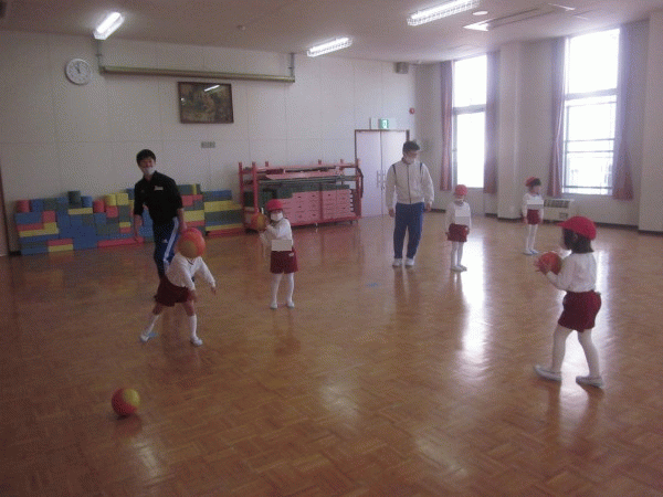 手をお皿にして両手でボールを取る練習をした後、耳の横からボールを投げる練習をしました☆段々とボールが飛ぶ距離も伸びてきて、子ども達も嬉しそうでした!