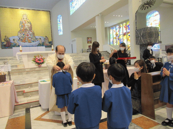 大聖堂に子どもたちと年長組の保護者の方が集い、一人ひとりの成長を喜ぶとともに、今まで見守ってくださった神様に、感謝の気持ちを込めてお祈りをお捧げしました。