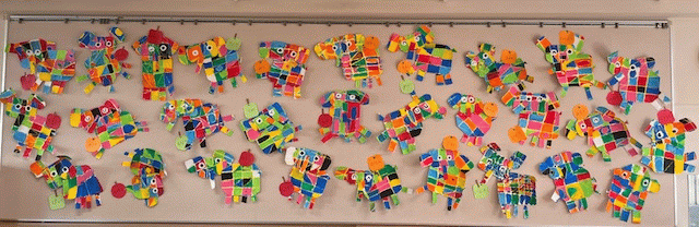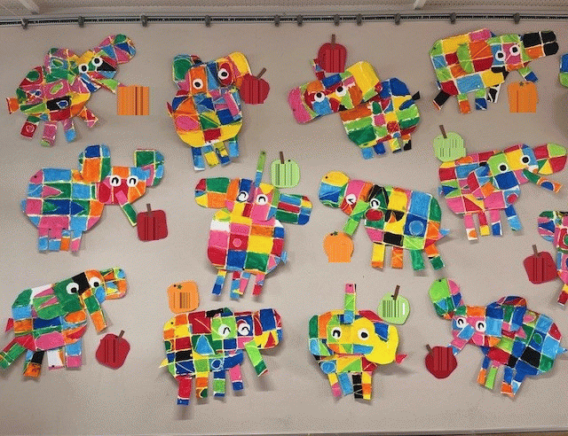 黄色のクレパスで線を描き、絵具で塗り分けて、パッチワークでエルマーを作りました!