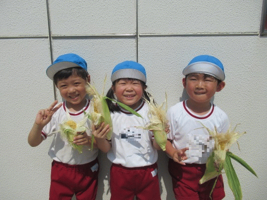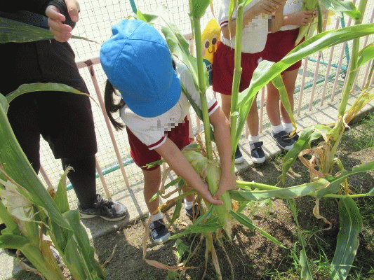 年長組で育てた「とうもろこし」が大きく育ったので、子どもたちと一緒に収穫しました(*^▽^*)